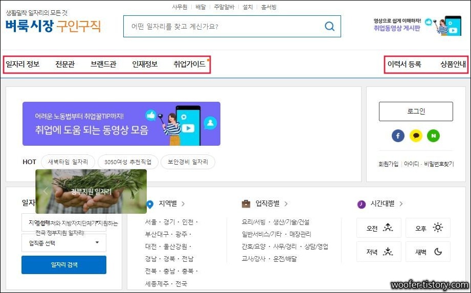 ▲ 좌측 [일자리 정보] 메뉴에서는 지역별, 역세권, 업종별, 직종별 일자리를 확인할 수 있습니다. 또, 근무형태에 따라 파트타임, 풀타임, 정부지원, 공공기관 일자리 등을 확인할 수 있으므로 참고하세요.