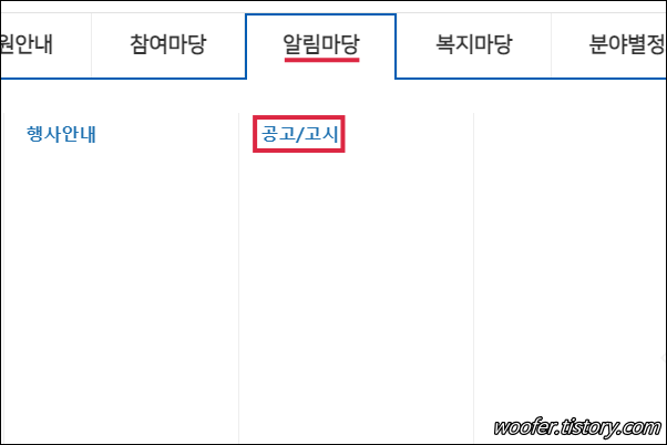 ▲ [알림마당] - [공고/고시] 메뉴에서는 성남시, 수정구 관련 기관의 관련 채용공고, 모집공고를 확인할 수 있습니다.