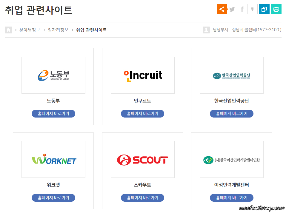 ▲ [취업 관련 사이트] 메뉴에서는 노동부, 인쿠르트, 한국산업인력공단, 워크넷, 스카이드, 여성인려개발센터 등 채용, 취업 관련 사이트 정보를 제공합니다.