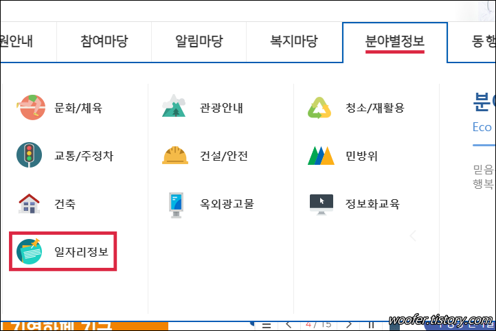 ▲ [분야별정보] - [일자리정보] 메뉴에서는 일자리센터, 일자리상담 관련 정보를 확인할 수 있습니다.