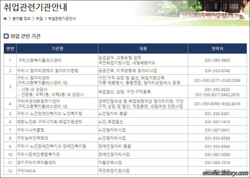 ▲ 구리고용복지플러스센터, 구리시 일자리경제과 일자리지원팀, 구리시니어클럽, 장애인종합복지관, 구리지역자활센터 등의 취업관련 기관 정보를 확인할 수 있습니다.