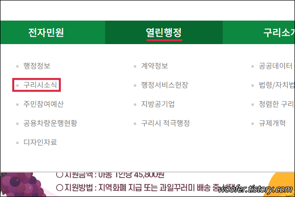 ▲ 검색결과에 나타나는 구리시청 홈페이지로 접속합니다. 해당 홈페이지에서는 구리시의 행정, 교육, 복지, 관광, 민원, 참여 등 다양한 정보, 서비스 등을 제공받을 수 있습니다.