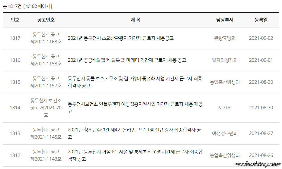 ▲ [채용공고] 메뉴에서는 소요산관광지, 자연휴양림 청소, 주정차 관리, 공공배달앱 배달특급 마케터, 인플루엔자 예방접종사업, 보건소 한시인력, 청소년 수련관, 동물보호 및 길고양이 중성화사업, 환경사업소 관련 채용공고, 모집공고를 확인할 수 있습니다.
