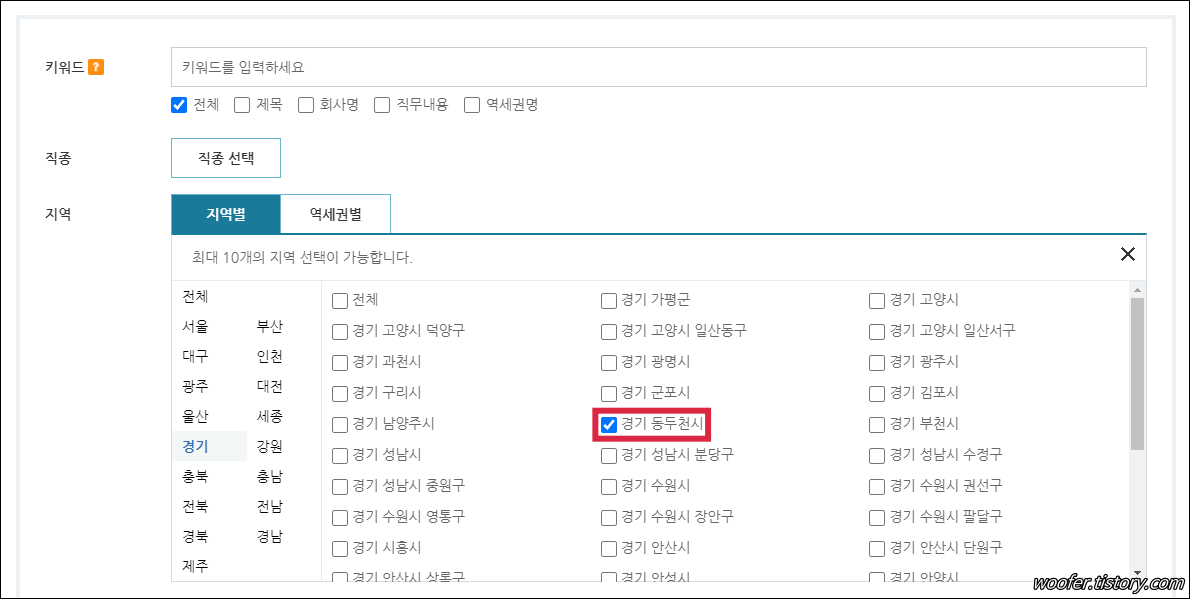 ▲ 지역별 메뉴에서 [경기 동두천시] 을 선택하여 검색합니다. 양주, 의정부, 포천, 남양주 등 희망하는 주변 지역을 추가하여 검색할 수도 있습니다.