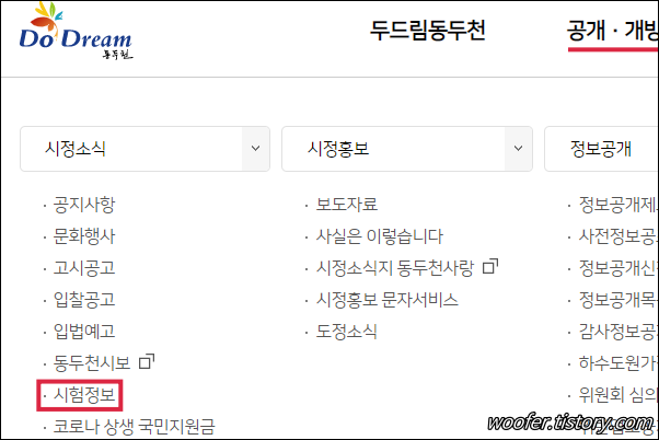 ▲ [공개,개방] - [시정소식] - [시험정보] 메뉴에서 동두천시 공무원 시험정보를 확인할 수 있습니다.