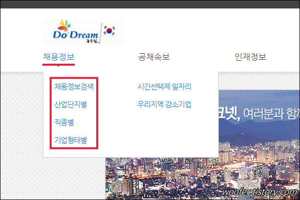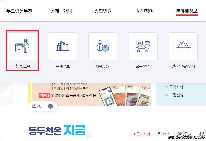 ▲ [취업/교육] 에는 일자리정보, 동두천고욕복지센터, 일자리센터 등의 취업 관련 메뉴가 있습니다.