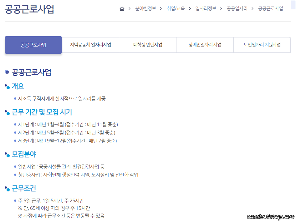 ▲ [공공일자리] 메뉴에서는 공공근로사업, 지역공동체 일자리사업, 대학생 인턴사업, 장애인일자리 사업, 노인일자리 사업 등의 내용을 확인할 수 있습니다. 저소득층, 청년층, 노년층, 취약계층을 위한 일자리 사업을 진행하고 있습니다.