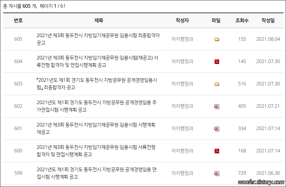 ▲ 동두천시 지방임기제공무원 임용시험, 공개경쟁임용 관련 시행계획, 서류, 면접 관련 공고를 확인할 수 있습니다.