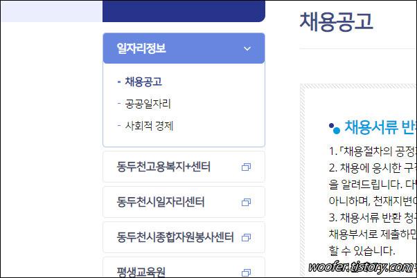 ▲ [분야별정보] - [취업/교육] 메뉴에서는 동두천시의 관공서, 공공기관 채용공고 및 공공일자리 등을 확인할 수 있습니다.