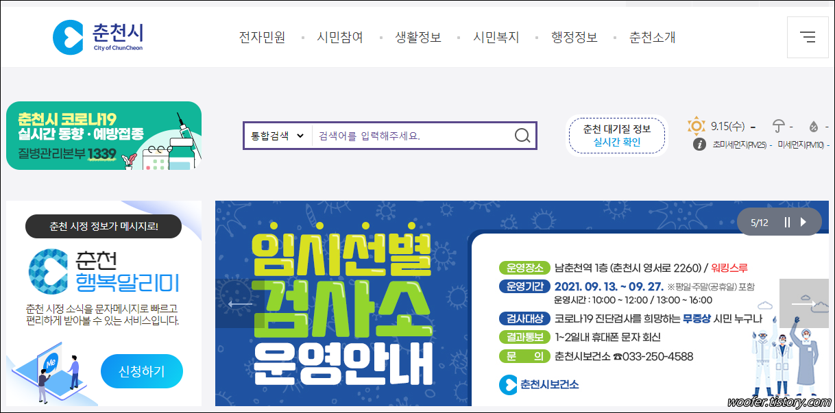 ▲ 춘천시청 홈페이지의 메인페이지입니다. 상단의 [전자민원], [시민참여], [생활정보], [시민복지], [행정정보] 등의 메뉴에서 춘천시에 관련된 다양한 정보를 확인할 수 있습니다.