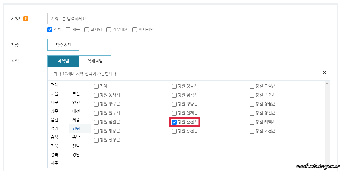 ▲ 지역별 검색에서 [강원 춘천시] 를 선택하여 검색합니다. 근무를 희망하는 주변 지역을 추가하여 검색할 수도 있습니다. 가평, 홍천, 화천, 양구, 인제 등의 지역을 추가하여 검색해보시길 바랍니다.