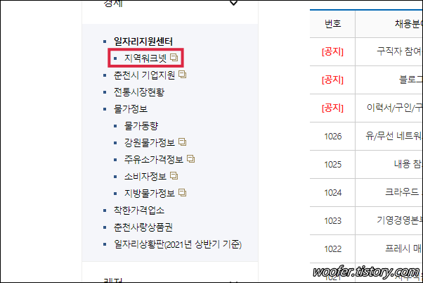 ▲ [지역워크넷] 메뉴를 통해 춘천시 일자리센터 홈페이지에 접속할 수 있습니다.
