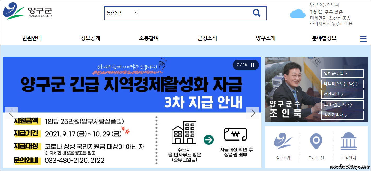 ▲ 검색결과에 나오는 양구군청 홈페이지로 접속합니다. 해당 홈페이지에서 양구의 교통, 생활, 민원, 관광, 복지 등 다양한 정보를 확인할 수 있습니다.