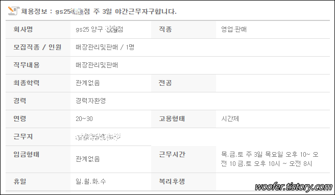 ▲ 채용공고 하나를 확인해보면 편의점에서 주 3일 야간근무자를 모집하는 공고가 있습니다. 모집요강을 통해 근무시간, 근무기간, 복지, 급여, 근무내용 등 자세한 근무조건을 확인할 수 있습니다. 자세한 근무조건을 확인하시고 지원, 연락하사길 바랍니다.