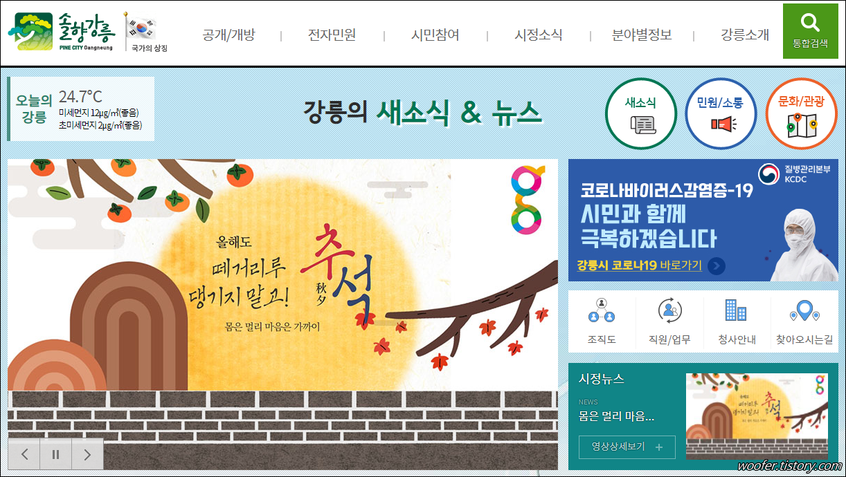 ▲ 강릉시청 홈페이지의 메인페이지입니다. 상단의 [공개/개방], [전자민원], [시민참여], [시정소식], [분야별정보] 등의 메뉴에서 강릉에 관련된 다양한 정보들을 제공하고 있습니다.