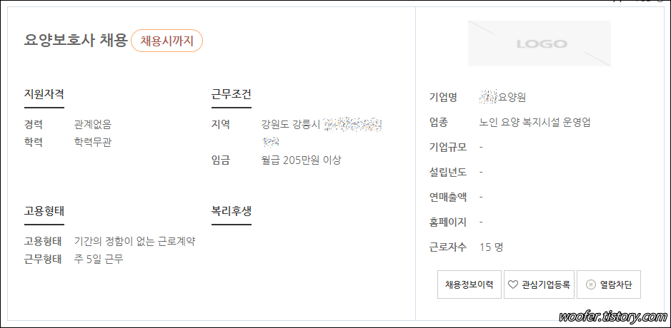 ▲ 채용공고 하나를 확인해보면 요양원에서 요양보호사를 모집하는 공고가 있습니다. 모집요강을 통해 근무시간, 근무기간, 월급, 근무지 등 자세한 근무조건을 확인할 수 있습니다. 가급적 자세한 근무조건을 확인하시고 지원하시길 바랍니다.
