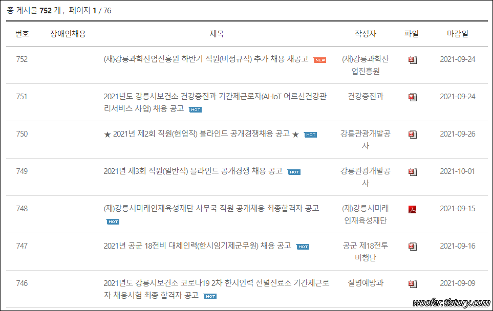 ▲ [시정소식] - [채용/시험] - [채용정보] 메뉴에서 강릉시에 속한 공공기관, 산하기관, 관공서 등의 구인공고, 모집공고를 확인할 수 있습니다.