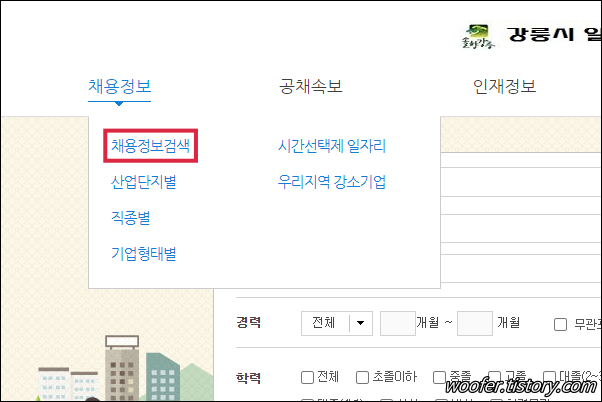 ▲ [채용정보] - [채용정보검색] 메뉴에서 강릉시의 구인공고, 채용공고를 검색할 수 있습니다.
