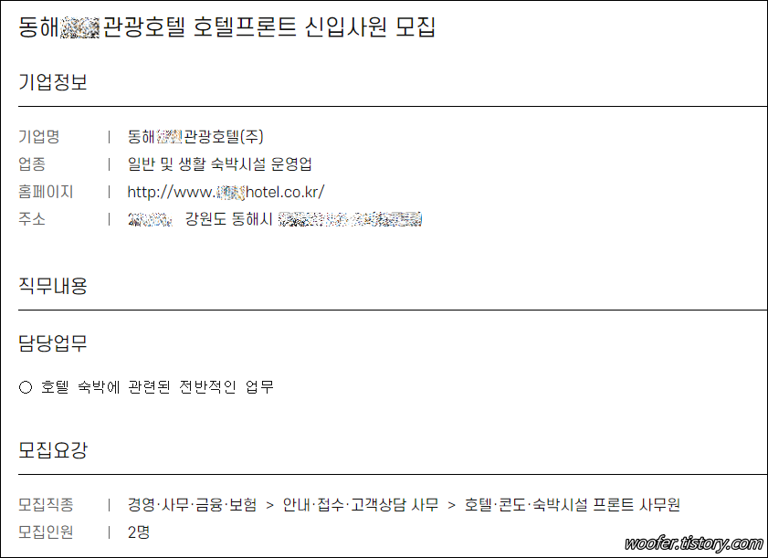 ▲ 채용공고 하나를 확인해보면 호텔에서 프론트 직원을 모집하는 공고가 있습니다. 모집요강을 통해 근무지, 월급, 근무시간, 근무내용 등 자세한 근무조건을 확인할 수 있습니다. 자세한 근무조건을 확인하시고 지원, 연락하사길 바랍니다.