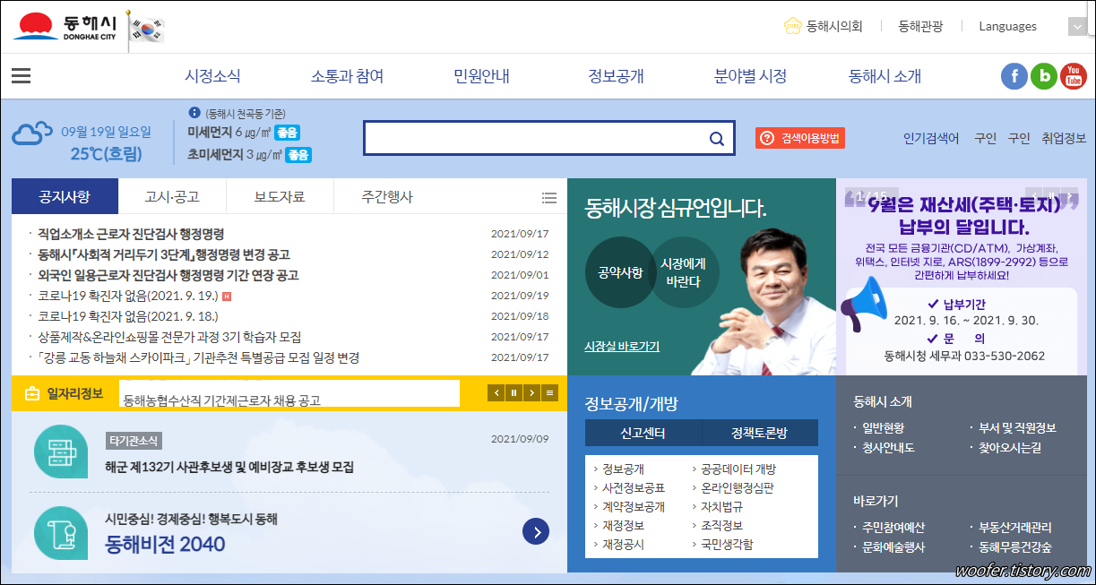 ▲ 동해시청 홈페이지의 메인페이지입니다. 상단의 [시정소식], [소통과참여], [민원안내], [정보공개] 등의 메뉴에서 동해시에 관련된 다양한 정보들을 제공합니다.