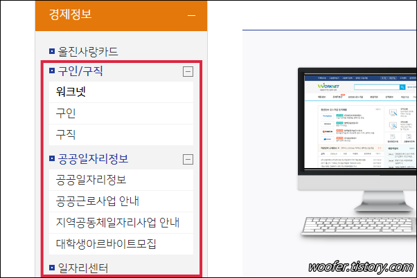 ▲ [분야별정보] - [경제정보] 메뉴에서 울진군의 취업, 일자리 관련 정보를 확인할 수 있습니다.