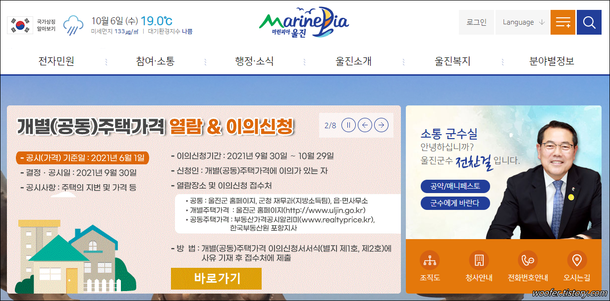 ▲ 먼저 포털사이트에서 '울진군청' 을 검색하여 울진군청 홈페이지에 접속합니다. 해당 홈페이지에서 울진군의 행정, 민원, 복지, 관광, 여행 등의 정보를 확인할 수 있습니다.