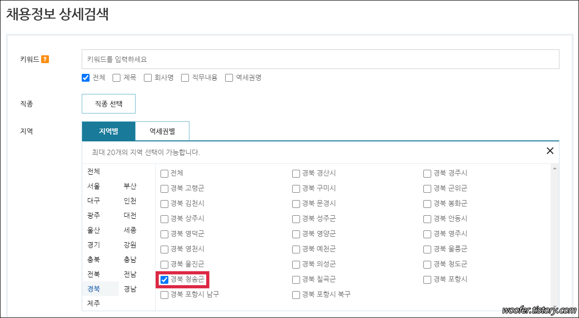 ▲ 지역별 검색 메뉴에서 [경북 청송군] 을 선택하여 검색합니다. 청송 주변의 영양, 영덕, 안동, 의성 등의 지역을 추가하여 검색하는 것도 좋습니다.