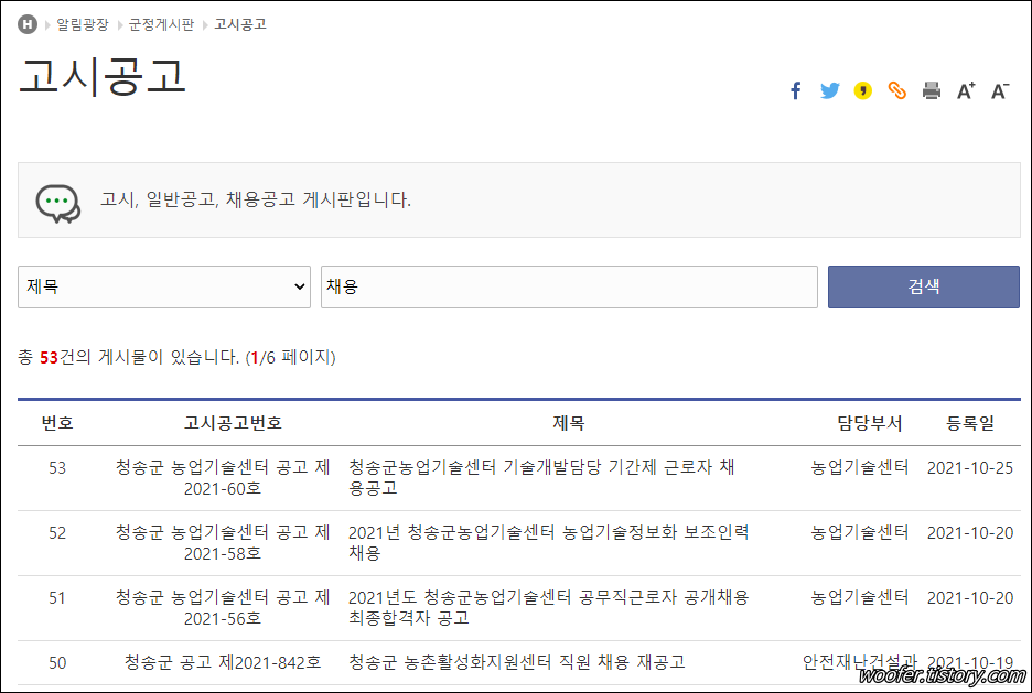 ▲ [고시공고] 메뉴에서 채용, 모집 등의 키워드로 검색해 청송군 관련 채용공고, 모집공고를 확인할 수 있습니다.