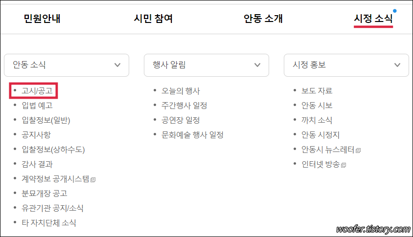 ▲ [시정소식] - [안동소식] - [고시/공고] 메뉴에서 안동시의 관공서, 공공기관, 산하기관 등의 채용정보를 제공하고 있습니다.