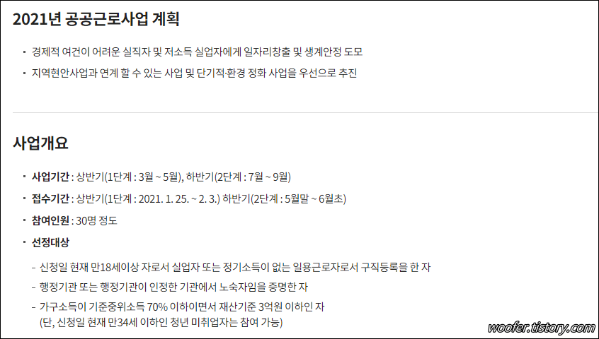 ▲ [공공근로사업] 메뉴에서는 실직자, 저소득자를 위한 일자리창출, 생계안정 관련 사업을 확인할 수 있습니다.