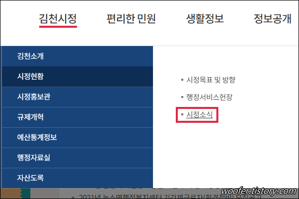 ▲ [김천시정] - [시정현황] - [시정소식] 메뉴에서 김천시의 관공서, 공공기관, 산하기관 등의 채용정보를 확인할 수 있습니다.