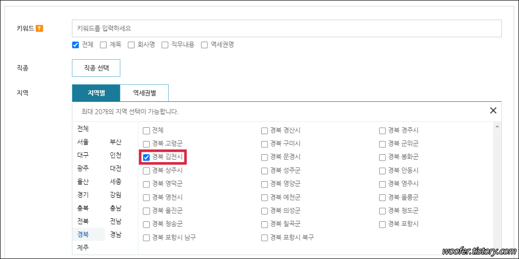 ▲ 지역별 검색 메뉴에서 [경북 김천시] 을 선택하여 검색합니다. 또는 근무를 희망하는 주변 지역을 선택하여 검색할 수도 있습니다. 구미, 영동, 상주, 성주 등 주변 지역을 추가하여 검색해보시는 것을 추천합니다.