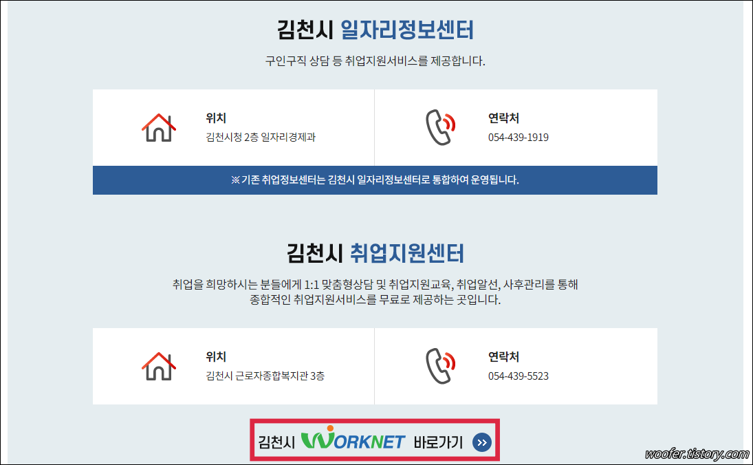 ▲ [일자리정보센터] 메뉴에서는 김천시에 운영되고 있는 온라인, 오프라인 일자리센터(취업지원센터)의 정보를 확인할 수 있습니다. 하단 링크를 통해 김천시 일자리센터 홈페이지에 접속할 수 있습니다.