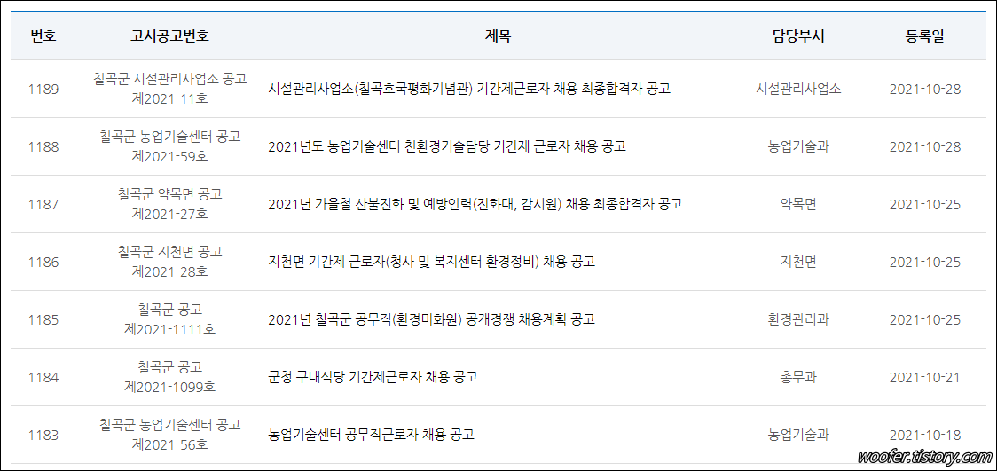 ▲ [칠곡소식] - [알림마당] - [공고/고시] 메뉴에서 칠곡군의 정부기관, 관공서, 공공기관 등의 채용정보를 게시하고 있습니다.