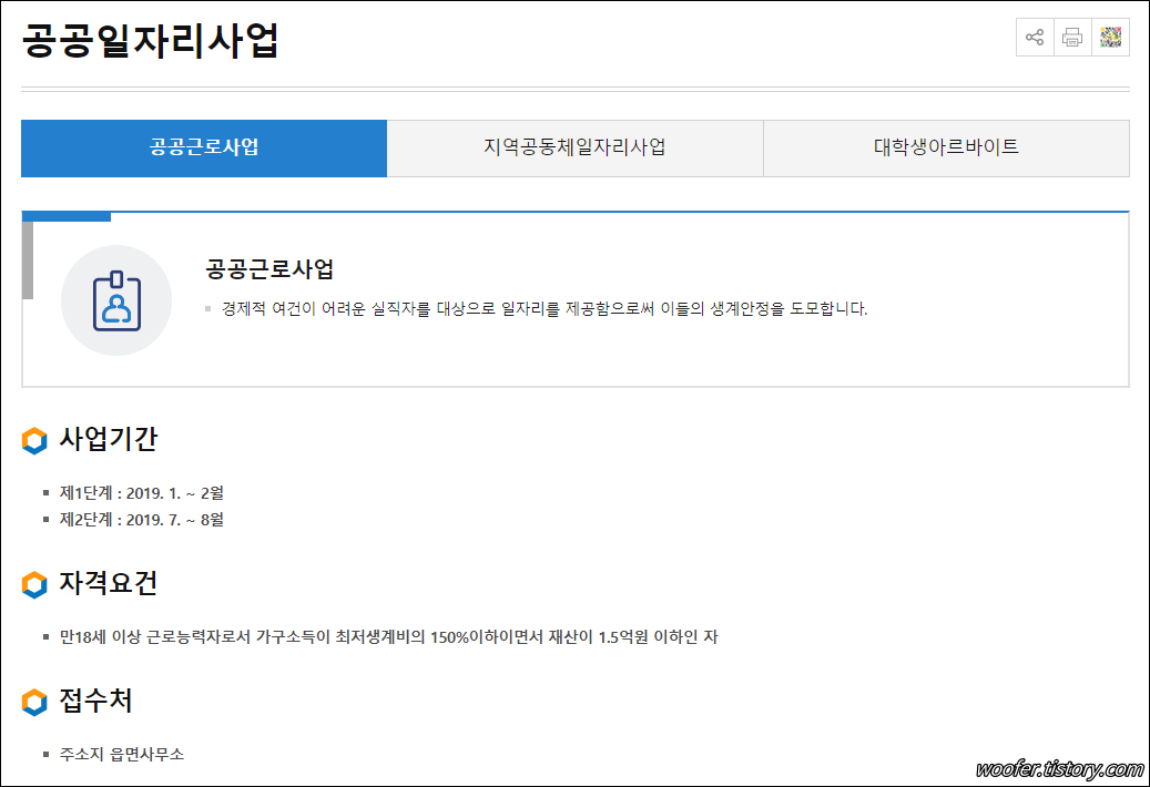 ▲ 의성군의 공공근로사업, 지역공동체일자리사업, 대학새아르바이트 등의 정보를 확인할 수 있습니다. 경제적 여건이 어려운 실직자, 취업취약계층, 저소득층, 대학생 등을 위한 일자리사업을 진행하고 있습니다.
