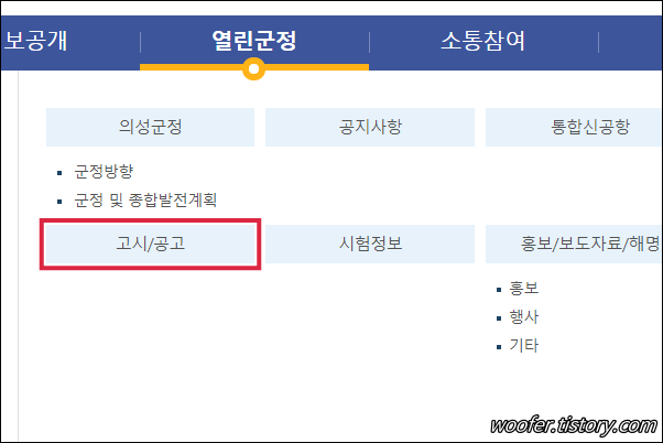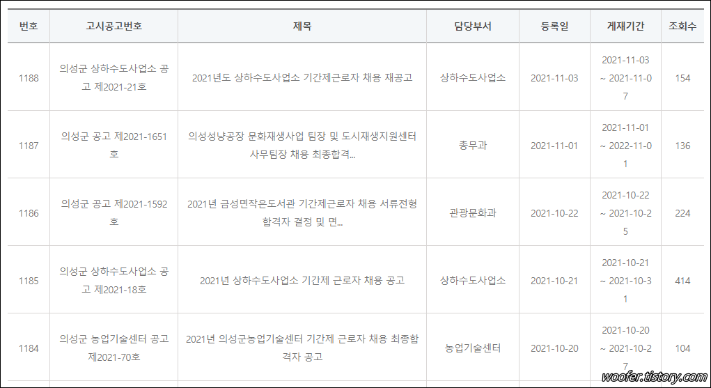 ▲ [열린군정] - [고시/공고] 메뉴에서 의성군의 관공서, 공공기관, 산하기관의 채용정보를 제공하고 있습니다.