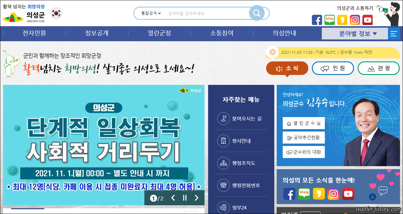 ▲ 의성군청 홈페이지의 메인페이지입니다. 상단의 [전자민원], [정보공개], [열린군정], [소통참여] 등의 메뉴에서 의성군에 관련된 다양한 정보, 소식을 제공하고 있습니다.