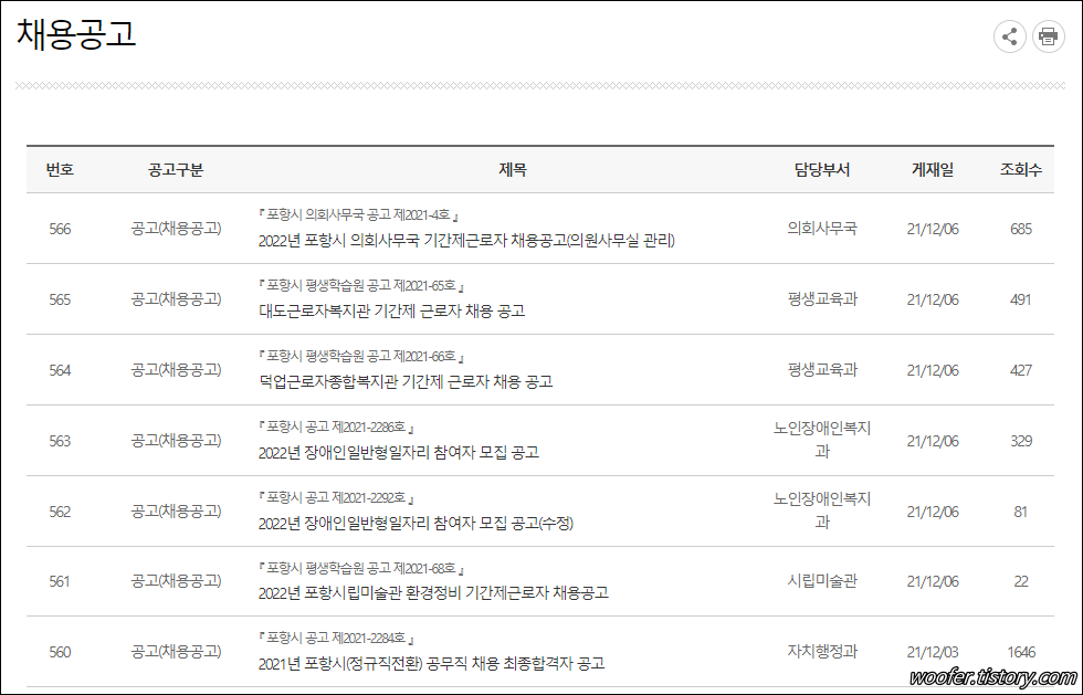 ▲ [채용공고] 메뉴에서 근로복지관, 포항시립미술관, 도서관, 보건소, 행복일자리사업, 지역아동센터, 농수산물도매시장 등의 채용공고, 모집공고를 확인할 수 있습니다.