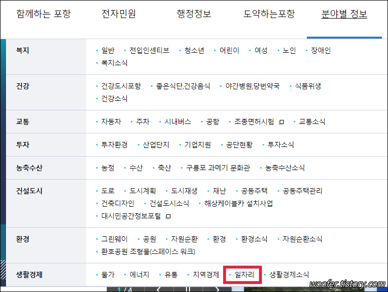 ▲ [분야별정보] - [생활경제] - [일자리] 메뉴에서 포항시의 일자리, 취업 관련 정보를 제공하고 있습니다.
