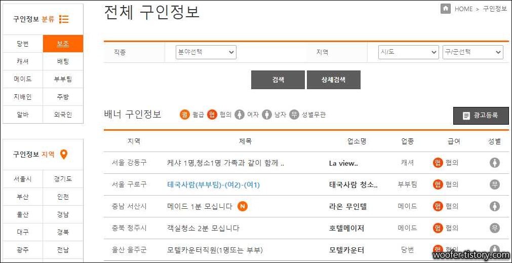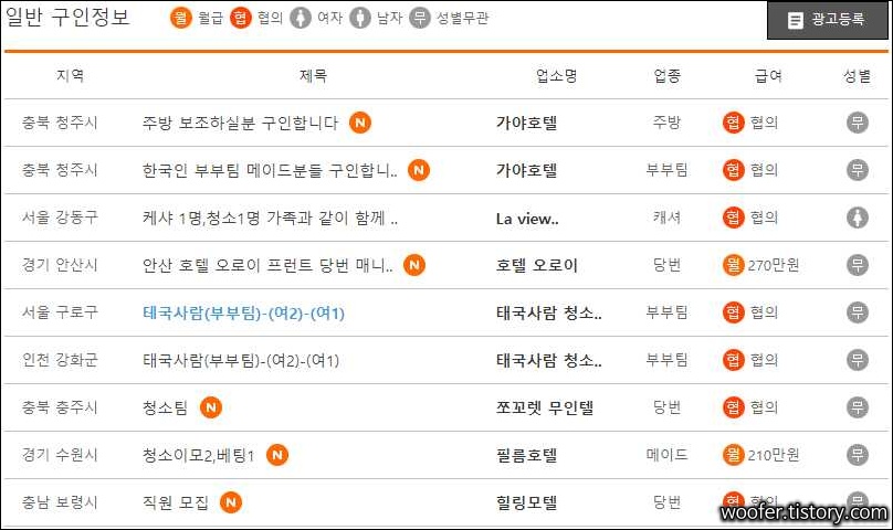 ▲ [구인정보]에서는 지배인, 당번, 당번보조, 캐셔, 부부팀, 주방, 룸메이드, 주차관리, 베팅, 청소, 욕실처옷, 프론트, 알바 등 다양한 직종에 따른 채용정보를 제공하고 있습니다. 위의 리스트에서 룸메이드, 청소알바, 야간청소 등 다양한 구인공고가 올라온 것을 확인할 수 있습니다.