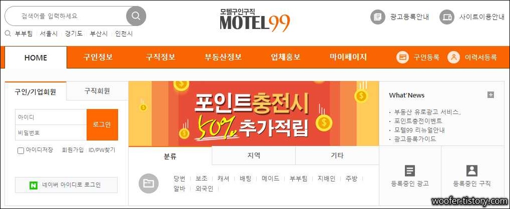 ▲ 모텔99는 모텔 관련 룸메이드, 캐셔, 당번, 당번보조, 부부팀, 주방보조, 카운터직원 등 다양한 구인구직 정보를 제공하는 사이트입니다. 직접 구직정보를 등록할 수도 있으며, 모텔매매정보, 업체홍보 서비스도 이용할 수 있는 것이 특징입니다.