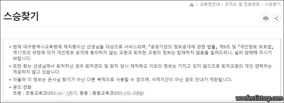 ▲ 대구광역시 교육청에 재직 중인 선생님을 대상으로 스승찾기 서비스를 이용할 수 있습니다. 다만, 퇴직한 선생님의 전보는 없다고 합니다. 또한, 제자가 아닌 경우에는 정보가 제공되지 않는 점도 참고 부탁드립니다.