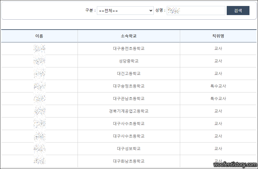 ▲ 유치원, 초등학교, 중학교, 고등학교, 특수학교 등의 구분을 선택하고 성명을 검색합니다. 검색 가능한 대구시의 하위 행정구역은 아래와 같습니다.