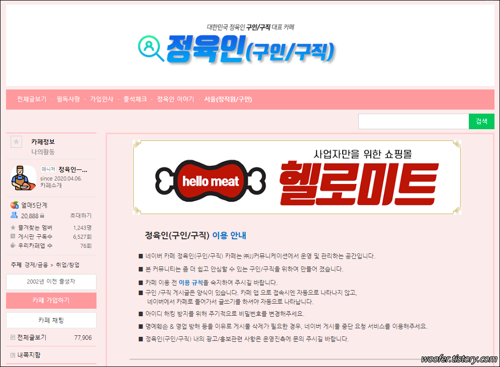 ▲ 정육인은 축산, 정육 관련 일에 종사하는 사람들의 커뮤니티(네이버카페) 입니다. 정육업 관련 정직원, 아르바이트, 프리랜서 등의 구인구직 정보와 정육 관련 정보를 확인할 수 있습니다.