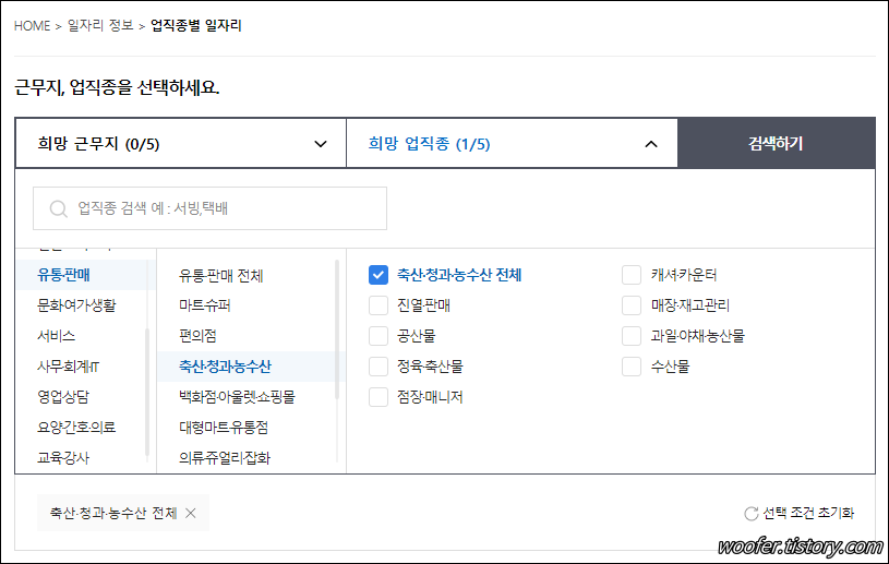 ▲ [유통,판매], [축산,청과,농수산] 메뉴를 선택하여 검색합니다. 검색 메뉴에서 정육점, 정육기술자, 정육코너, 정육직원 등의 키워드로 검색하는 것도 좋은 방법입니다.