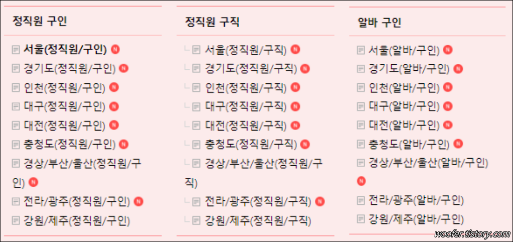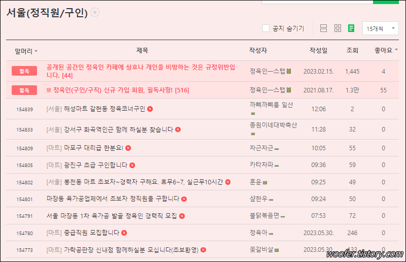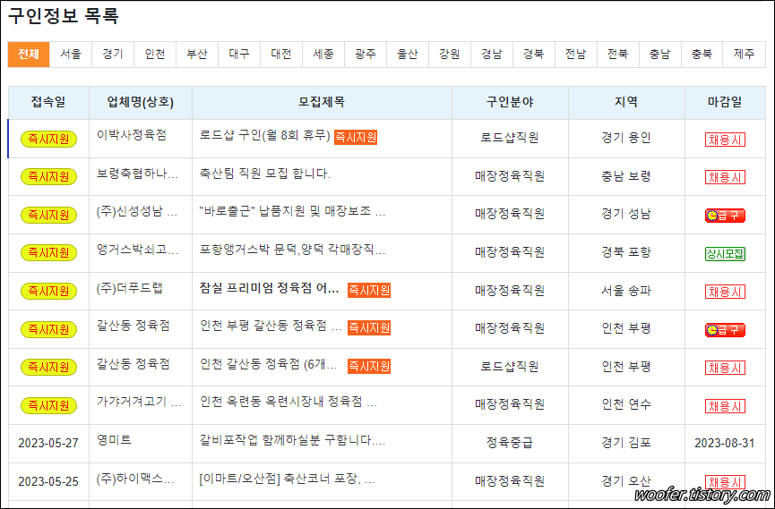 ▲ 서울 지역의 정직원 구인 게시판을 보면, 정육코너, 정육 경력직, 정직원, 직영매장 직원, 중급직원, 초급직원, 신입 정육사, 정육식당 주방실장, 정육작업자, 육가공 발골 정육인 등의 채용공고를 확인할 수 있습니다.